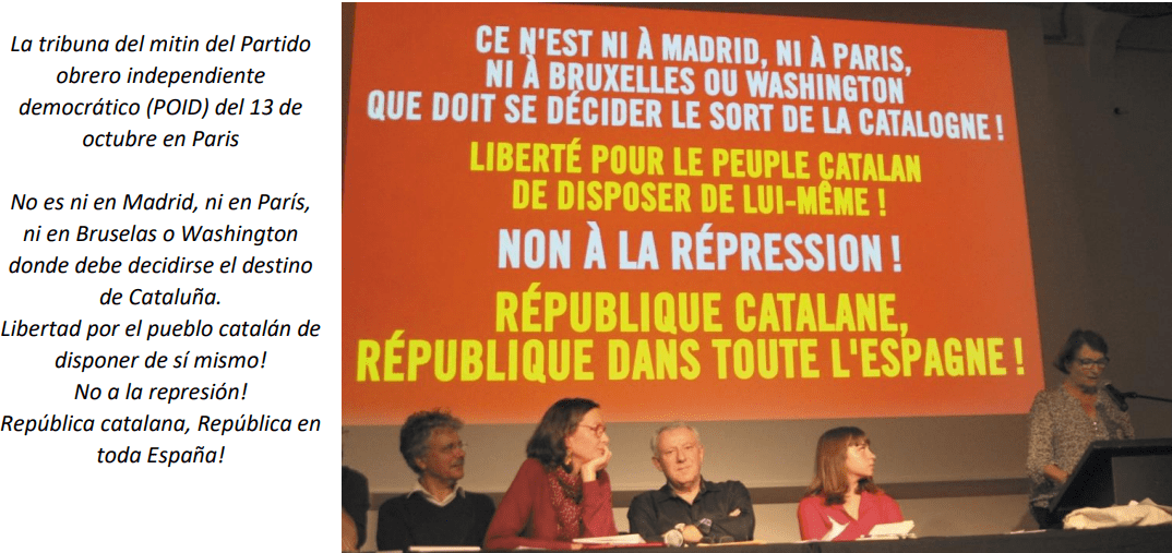 El mismo día en que aparece este número de la Carta semanal, se difunde en Francia una “declaración del Buró nacional del Partido obrero independiente (POI)” Una declaración que hace solo una página… en la que la única referencia indirecta a los acontecimientos en Cataluña se resume con esta frase: «Macron se encuentra en lo más bajo de los sondeos, el presidente de los ricos, sin cimiento político, como lo son muchos otros gobiernos de países de Europa, como en Alemania, en España donde el poder monárquico heredero del franquismo se encuentra con grandes dificultades.»