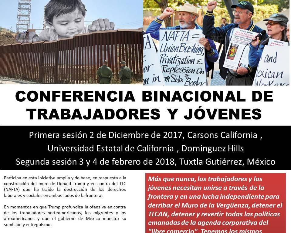 Los días 2 y 3 de diciembre del 2017, se llevó a cabo en Carson, California, la Conferencia Binacional por la Cancelación del TLCAN, Echar Abajo el Muro de la Verguenza / Fin a Todas las Deportaciones, Alto a las Privatizaciones, e Impulsar los Derechos Laborales en Ambos Lados de la Frontera, con la participación de más de 200 sindicalistas y activistas en Estados Unidos y México. El primer día de la session se realize en la Universidad Estatal de California-Dominguez Hills cuyo anfitrión fue el Departamento de Lenguas Modernas de la Universidad, y la CSUDH de la Asociación de la Facultlad en California; la session del Segundo día se llevó a cabo en el salon del Local 675 Sindicato de los Trabajadores Metalúrgicos.