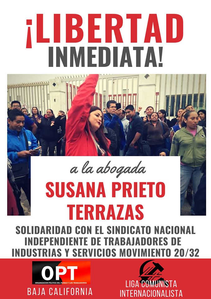 Por medio de la presente nos dirigimos al Gobernador del Edo. de Tamaulipas, Francisco Javier García Cabeza de Vaca y a la Fiscalía General de Justicia de Tamaulipas, para EXIGIR LA LIBERACIÓN INMEDIATA DE LA COMPAÑERA SUSANA PRIETO TERRAZAS, activista y abogada laboral defensora de trabajadoras y trabajadores de maquiladora en México, dirigente del movimiento 20/32 en Matamoros, Tamaulipas.