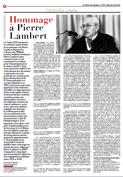 El 9 de junio de 2020 se cumplirá el centenario del nacimiento de Pierre Lambert desapareció hace doce años. Trabajador militante, militante trotskista, Pierre Lambert habrá dedicado toda su vida consciente a la lucha por la emancipación de la clase trabajadora. Para nosotros, que hicimos campaña junto a él durante décadas y que participamos con él en la lucha por la reconstrucción de la Cuarta Internacional y su reproclamación en 1993; para nosotros, que aprendimos con él cómo trabajar para reagruparnos en una vanguardia en torno a un periódico que al mismo tiempo constituye una plataforma libre abierta a trabajadores militantes de todas las tendencias; Para nosotros, quienes estamos comprometidos con él en la lucha por ayuda en la reconstrucción del movimiento obrero en un nuevo eje, el de la independencia, es importante recordar esta fecha de aniversario para los lectores de La Tribune de los Trabajadores, independientemente del movimiento de la clase trabajadora al que pertenecen.