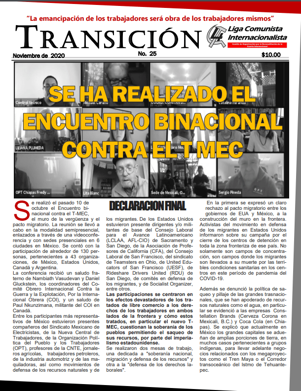 Esta a la venta el Boletín Transición, organismo de la LCI-CORCI, en su número 25 noviembre de 2020. Este número esta dedicado a la publicación de los resultados del Encuentro Binacional contra el T MEC, realizado el pasado 10 de octubre con la participación de mas de 130 asistentes de 43 organizaciones y cuatro países.