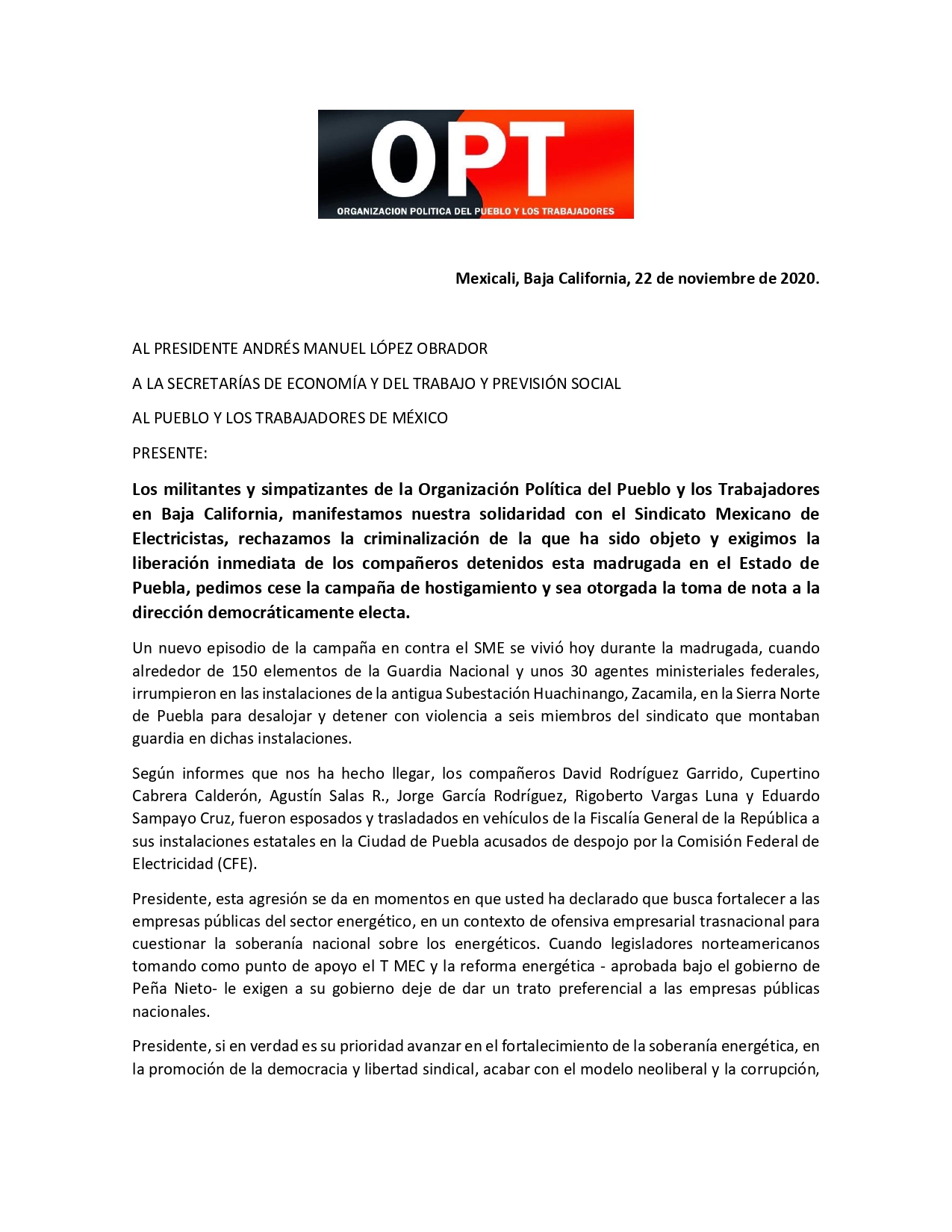 Los militantes y simpatizantes de la Organización Política del Pueblo y los Trabajadores en Baja California, manifestamos nuestra solidaridad con el Sindicato Mexicano de Electricistas, rechazamos la criminalización de la que ha sido objeto y exigimos la liberación inmediata de los compañeros detenidos esta madrugada en el Estado de Puebla, pedimos cese la campaña de hostigamiento y sea otorgada la toma de nota a la dirección democráticamente electa.