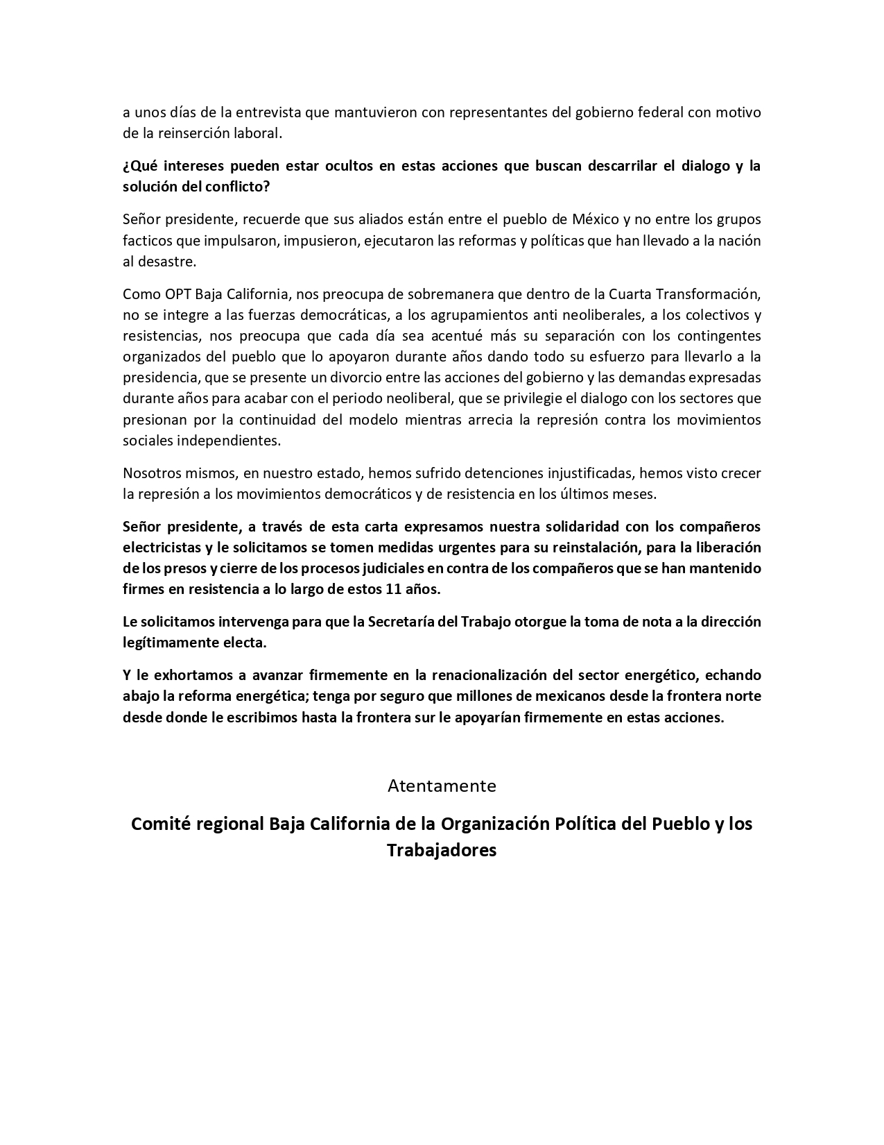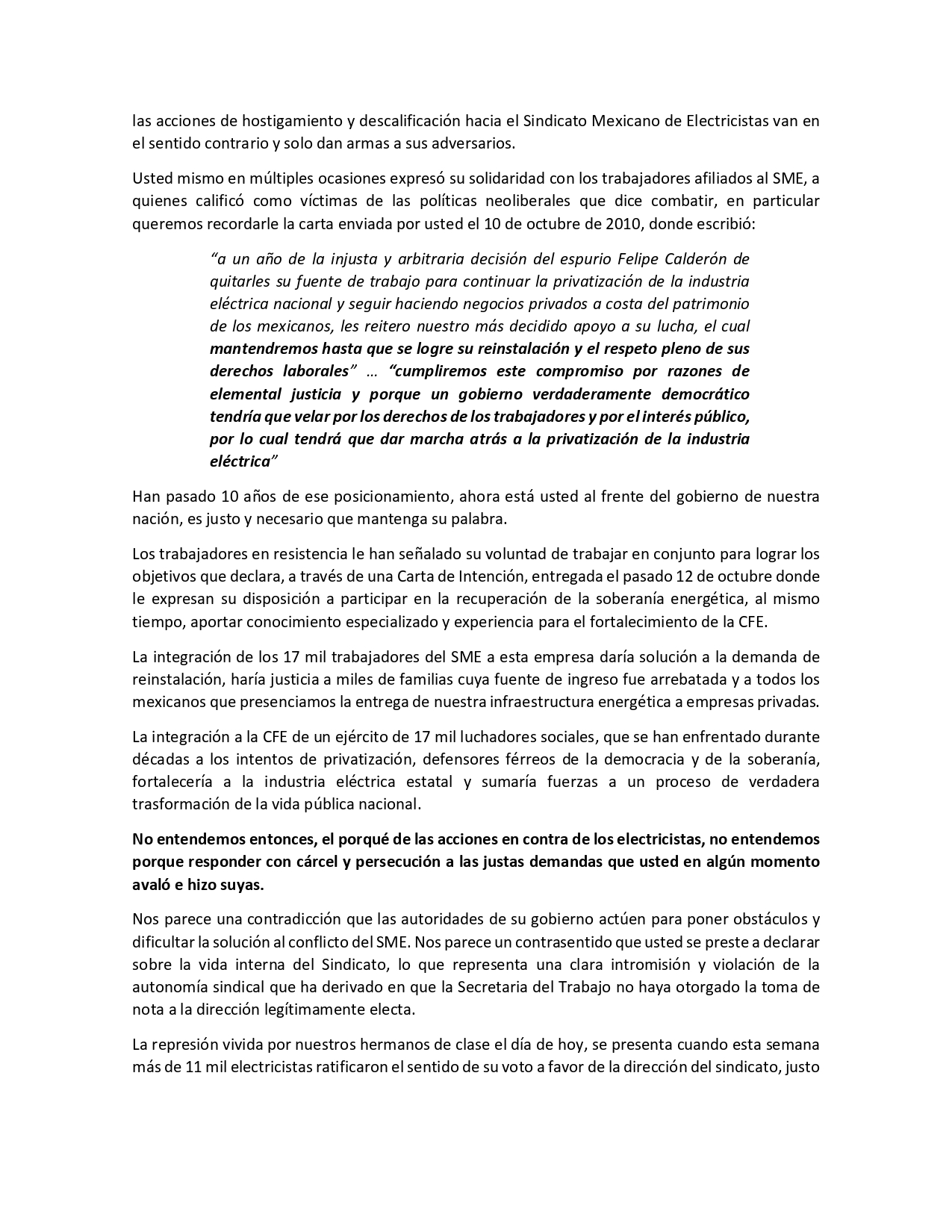 Señor presidente, a través de esta carta expresamos nuestra solidaridad con los compañeros electricistas y le solicitamos se tomen medidas urgentes para su reinstalación, para la liberación de los presos y cierre de los procesos judiciales en contra de los compañeros que se han mantenido firmes en resistencia a lo largo de estos 11 años.