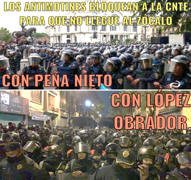 En la madrugada de ese día se dieron acontecimientos completamente semejantes a como operaba el PRIAN, es decir, la formación de policías, cuya retaguardia la reforzaban camiones de policías que de igual manera bloqueaban el paso de la CNTE, los policías tomaron fotos y videos del contingente que intentó penetrar las vallas de seguridad, tal como lo hacía el régimen represor de Enrique Peña Nieto.