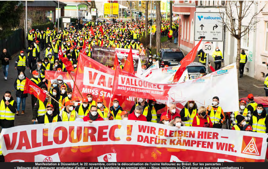 Vallourec depende del petróleo y el gas. (…) [Pero] lo que le interesa al grupo no es saber qué productos se necesitan o cuáles se deben desarrollar, sino que, en cuanto a la deslocalización de la producción a Brasil, el objetivo es reducir los costos laborales y energéticos. Se nos dice que las tuberías se pueden producir un 25% más baratas en Brasil que en Alemania, incluso si las tuberías tienen que ser transportadas a través del Atlántico. Es una reminiscencia del cese de la minería del carbón en el área del Ruhr.