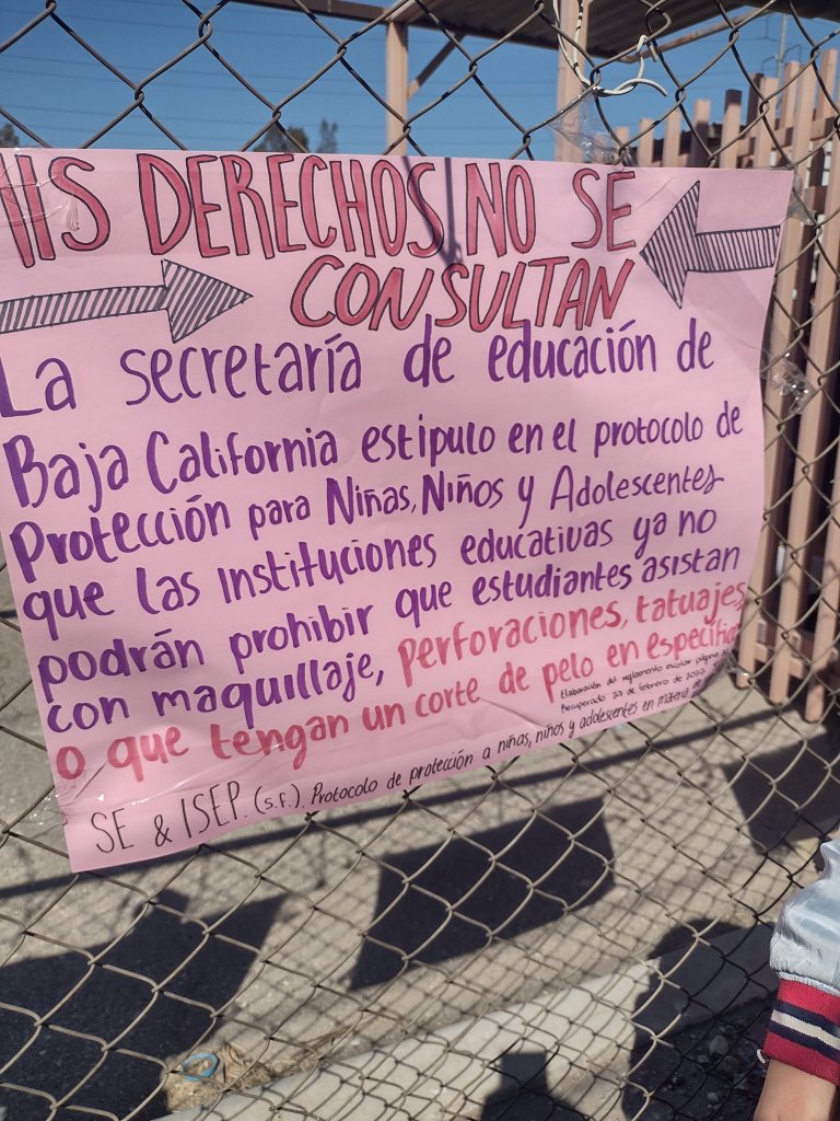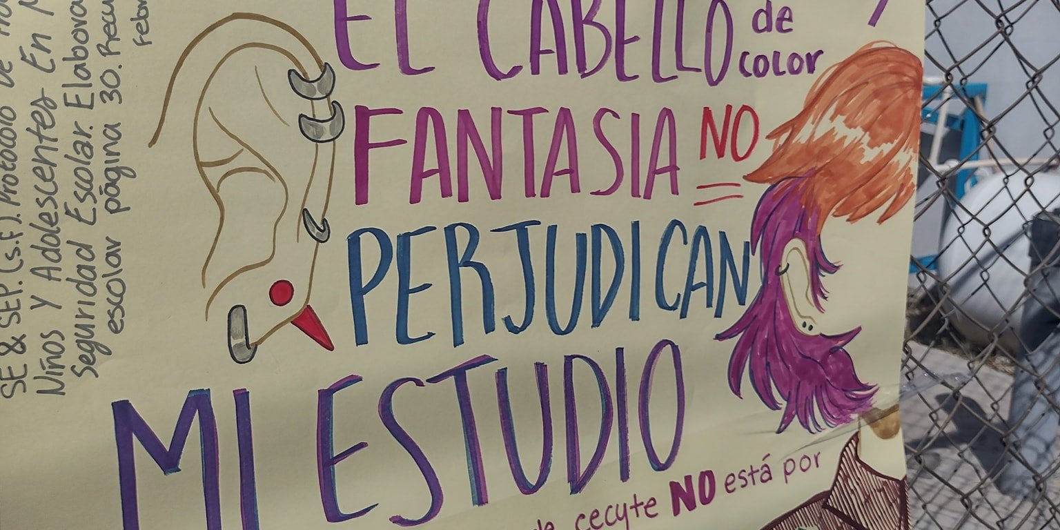 Laura: “Como este caso hay muchos, y esta es una de las principales causas por las que nos organizamos, hicimos carteles, que pegamos en la reja de la escuela y llamamos a los compañeros a que si estaban de acuerdo firmaran y ahí escribí que los reglamentos escolares bajo ninguna circunstancia están por encima del protocolo. “Nuestro color de pelo y nuestros piercing no afectan en nada nuestro estudio” quiero hacer énfasis que en todos los carteles pusimos las fuentes de información que son las del gobierno del Estado.