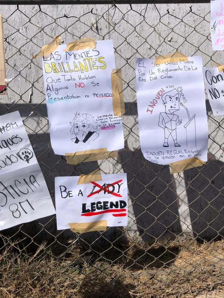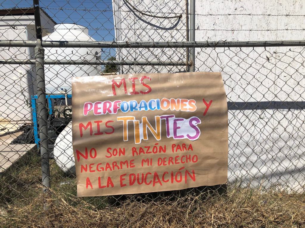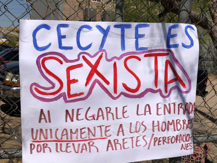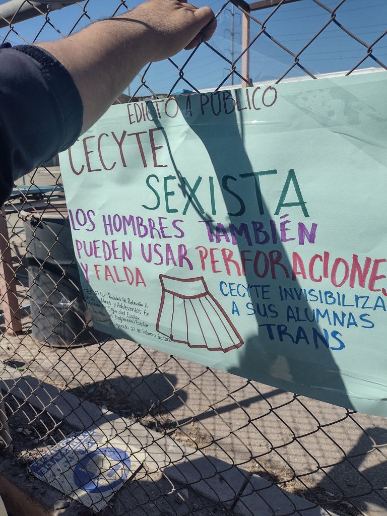 En otros carteles se leía que “Cecyte es sexista al no permitir que los varones usen aretes y las mujeres si”, “al no dejar que se use falda o pantalón de acuerdo a su identidad de género”