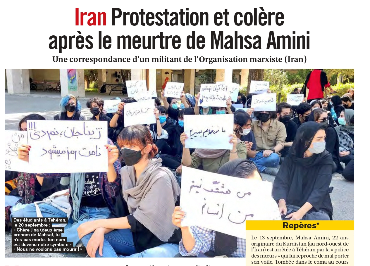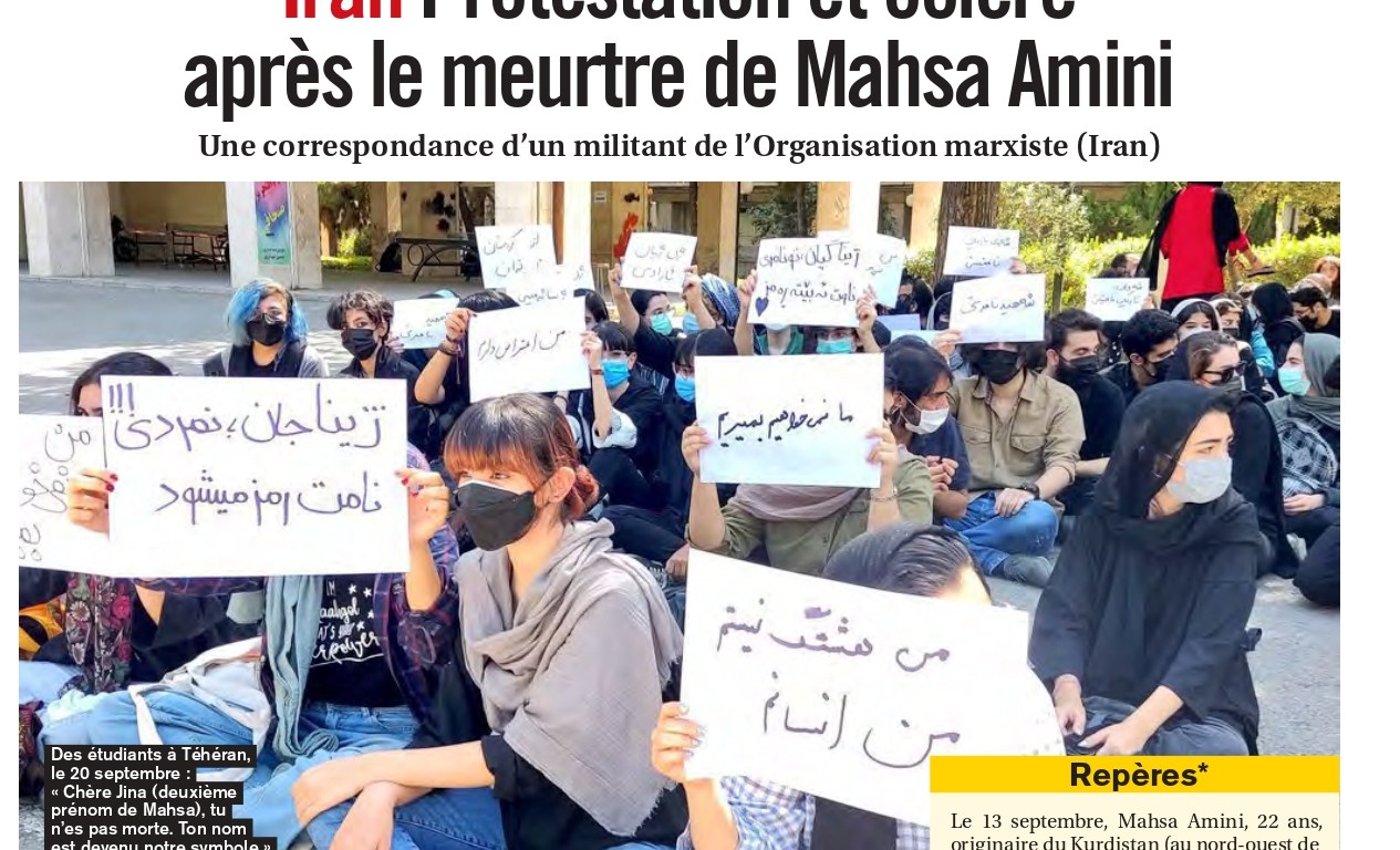 El 13 de septiembre, Mahsa Amini, de 22 años, originaria de Kurdistán (noroeste de Irán) fue detenida en Teherán por la «policía de la moral» que la acusó de llevar mal el velo. Cayendo en coma durante su detención, murió el 16 de septiembre. A partir del día 17 se produjeron manifestaciones en Kurdistán, paralizado por una huelga general. El día 19, las manifestaciones comenzaron en Teherán y se extendieron a las grandes ciudades una a una, con una fuerte participación de mujeres.