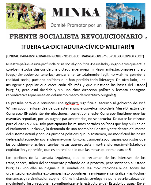 A continuación presentamos la declarción de MINKA (17 de enero 2023), comité promotor por un Frente socialista y Revolucionario, donde participan nuestros cmaradas del Grupo Socialista Internacionalista de Perú