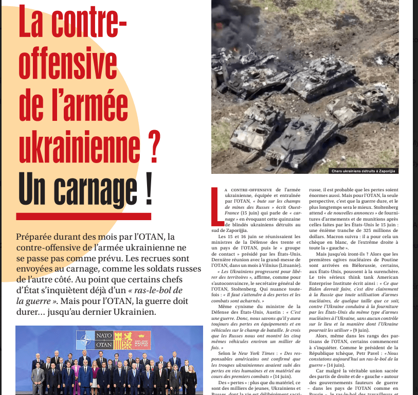 Preparada durante meses por la OTAN, la contraofensiva del ejército ucraniano no se desarrolla como fue previsto. Los reclutas son enviados a la masacre, así como los soldados rusos por su lado. Esto, al punto de que algunos jefes de Estado se inquietan ya de un “hartazgo de la guerra”. Aunque para la OTAN, la guerra debe durar… hasta que el último ucraniano quede de pie.