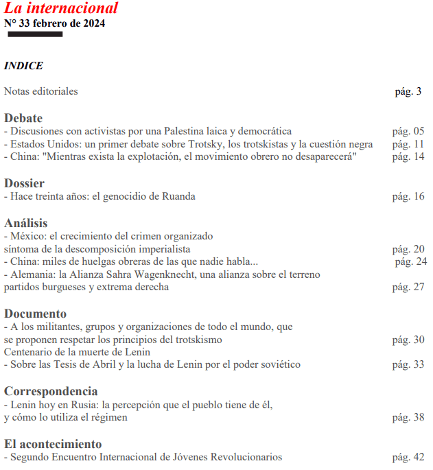 Los debates, la redacción y el trabajo conjunto con los militantes, grupos y tendencias presentes en la Conferencia Internacional continuaron junto con las organizaciones afiliadas al CORCI. Este número incluye entrevistas con militantes que luchan por un único Estado palestino laico y democrático en el territorio de la Palestina histórica, un informe sobre un debate con militantes negros en los Estados Unidos sobre las posiciones de Trotsky a favor del derecho a la autodeterminación/autoorganización de los negros en los Estados Unidos, y un informe de la reunión celebrada en la República Popular China sobre la Conferencia. Son los primeros materiales para continuar el debate sobre la construcción de la Internacional Obrera revolucionaria, esencial para la lucha revolucionaria de los trabajadores de todos los continentes.