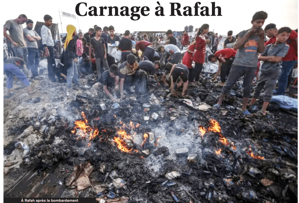 “Fue un disfuncionamiento trágico” se atrevió a declarar Netanyahu después de una nueva carnicería en Rafah. Incluso los títulos de la prensa tradicionalmente pro-israelitas se ven forzadas a reconocer “un horror de más”, como lo escribe l´Express el 28 de mayo: “Columnas de fuego, niños quemados vivos y mujeres agonizando sobre el suelo. Este 26 de mayo, una nueva visión del infierno surgió de las entrañas de la banda de Gaza, donde muchos misiles israelitas sembraron la muerte en un campo de refugiados. Decenas son las víctimas de lo que Benjamin Netanyahu ha calificado de “accidente trágico”. Pero para un “accidente trágico” filmado y difundido en el mundo entero ¿cantos permanecen invisibles en esta isla sitiada?”. Este golpeteo, añade el semanario, “ilustra el cinismo y la crueldad del gobierno de Netanyahu, muy pronto perseguido por crímenes a la humanidad”.