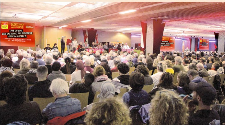 La sala de conferencias llena escucha a oradores de Rusia, Ucrania, Palestina, Kanak (Nueva Caledonia), Francia, Congo, Burkina Fasso, Alemania y España.