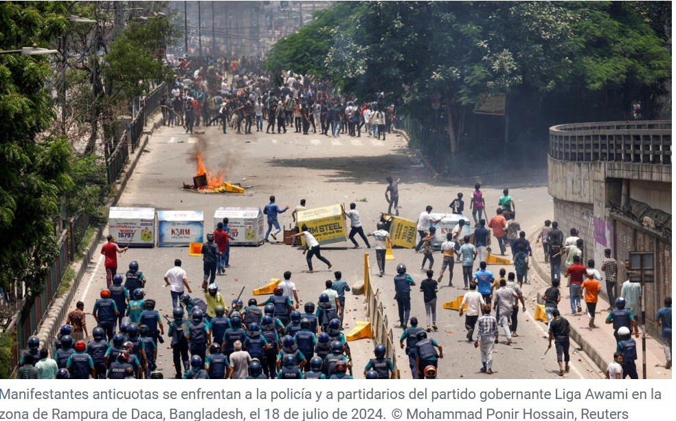 En 2018, las protestas estudiantiles provocaron una reducción del sistema de cuotas. Pero en junio de 2024, el Tribunal Superior revocó esta decisión. Esto desencadenó la movilización. Los estudiantes hicieron un “cierre total” de las universidades. Aunque el movimiento estudiantil fue espontáneo y pacífico, el gobierno permitió que grupos armados de la organización estudiantil del partido gubernamental, la Liga Chhatra, atacaran a los estudiantes con palos, barras de hierro y machetes.