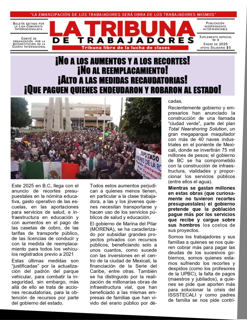 A continuación presentamos el suplemento de Tribuna de los Trabajadores que se distribuyo durante las manifestaciones de enero de 2025 contra el reemplamiento vehicular de la gobernadora Marina del Pilar en Baja California