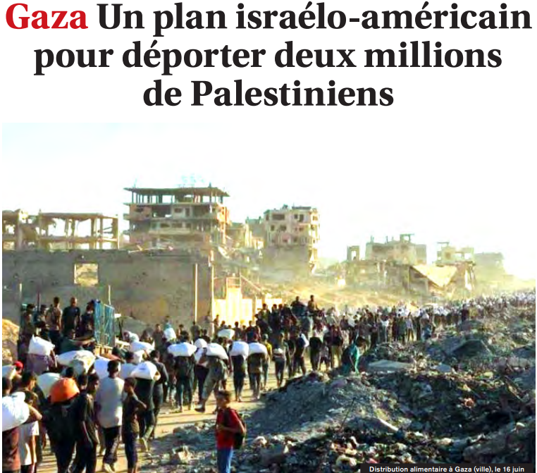 El 31 de agosto, el Washington Post hizo público un plan elaborado por los fundadores de la pseudo-organización humanitaria americano-israelita Gaza Humanitarian Foundation (GHF). Un plan conforme con las declaraciones de Trump en febrero de 2025 para vaciar la banda de Gaza de sus habitantes. Conforme también con el actual genocidio perpetrado por Israel, cuyo ejército está por dar el asalto final a Gaza.