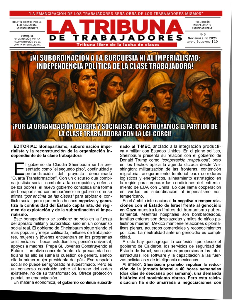 A continuación presentamos el editorial último ejemplar de Tribuna de Trabajadores, expresión publica de la LCI-CORCI, correspondiente a noviembre de 2025. Puedes descargar el ejemplar completo al final del texto